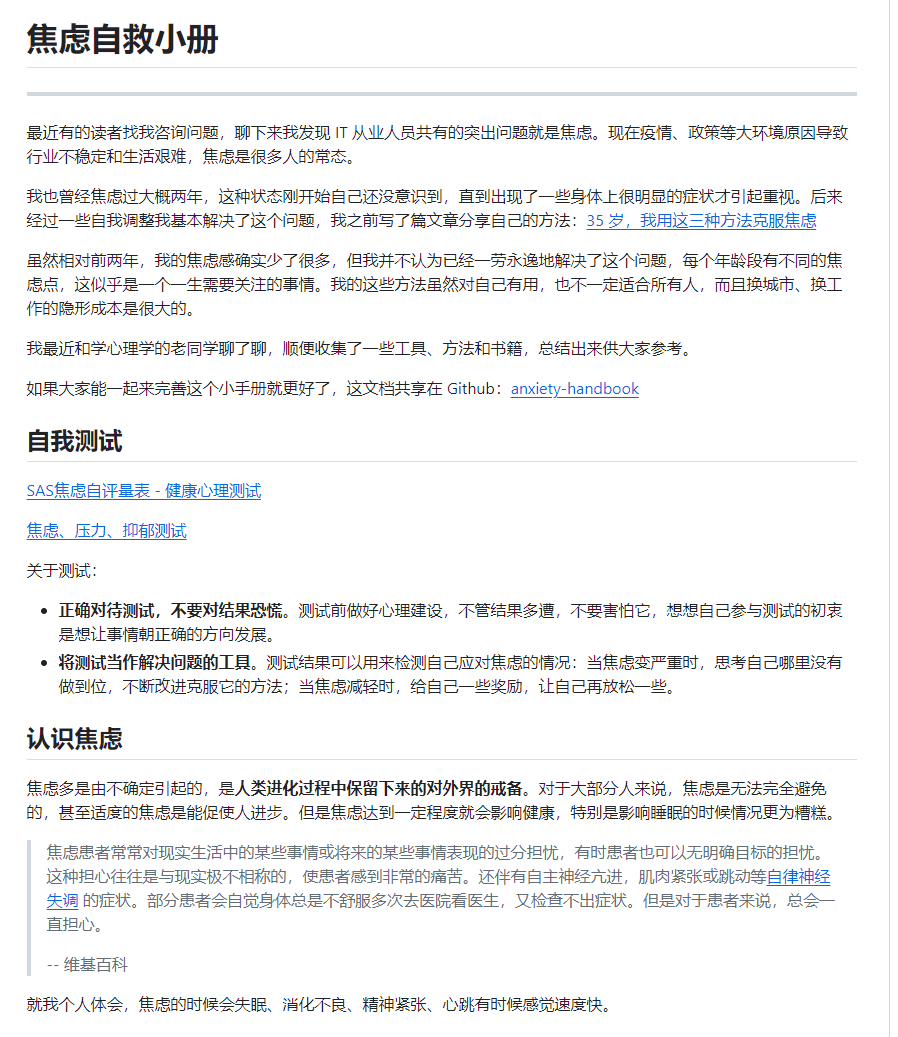 anxiety-handbook-焦虑自救小册,是网友总结的一份在线文档,网友发现 IT 从业人员共有的突出问题就是焦虑,而且现在政策等大环境原因导致行业不稳定和生活艰难,焦虑是很多人的常态,于是收集了一些工具、方法和书籍,总结出来供大家参考,文档详细地讲解包括焦虑自我测试、焦虑产生原因、认识焦虑、职场焦虑、职场PUA、改变认知和推荐书籍等等方面讲解。