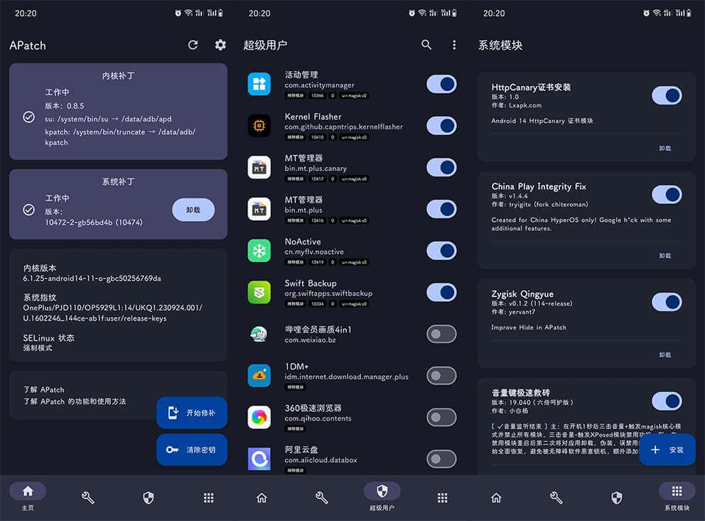 APatch是一种类似于Magisk或KernelSU的root解决方案,但APatch提供更多功能。 APatch分别结合了Magisk方便易用的通过boot.img安装的方法,和KernelSU强大的内核修补能力。