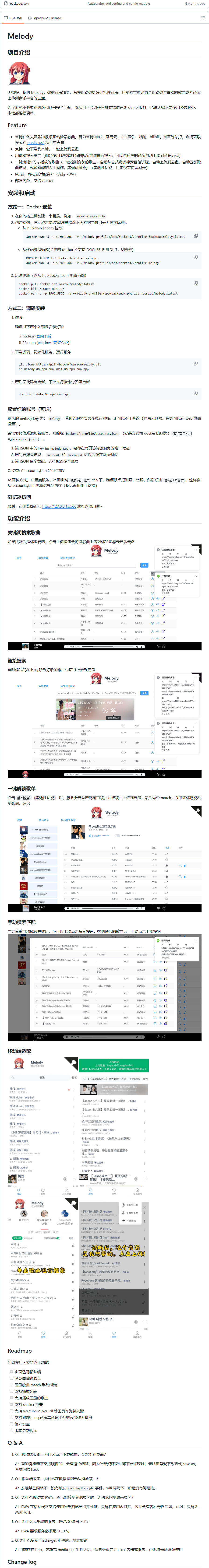 Melody-我的音乐精灵,一款音乐管理工具,旨在帮助你更好地管理音乐,目前的主要能力是帮助你将喜欢的歌曲或者音频上传到音乐平台的云盘。支持在各大音乐和视频网站检索歌曲,支持一键下载到本地,一键上传到云盘,一键“解锁”无法播放的歌曲(一键检测变灰的歌曲,自动从公共资源搜索最佳资源,自动上传到云盘,自动匹配歌曲信息。代替繁琐的人工操作,实现可播放)(实验性功能,目前仅支持网易云),项目工具非开箱即用,支持 docker部署,部署简单。
