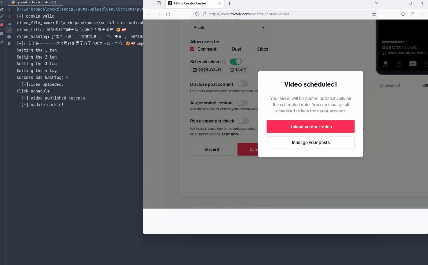 该项目旨在自动化上传视频到多个社交媒体平台,包括抖音、小红书、视频号、TikTok、YouTube 和 B 站等