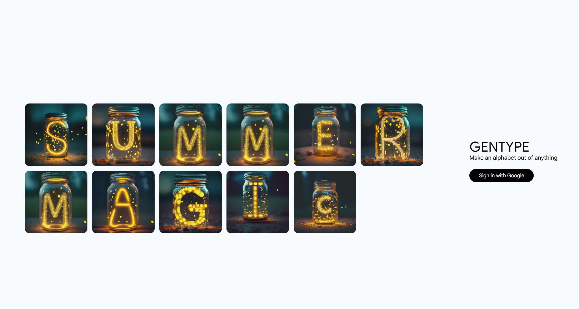 GenType 是一项 AI 实验,是基于 Imagen 2 API 构建的实验,可帮助任何人使用 Imagen 2 从任何内容中创建自定义字母表。只需一个提示,即可生成字母表的所有 26 个字母。实验室实验是使用 Google AI 构建的工具和玩具,旨在激发 AI 的新用例和 UX 范例,感兴趣的同学可以尝试一下。