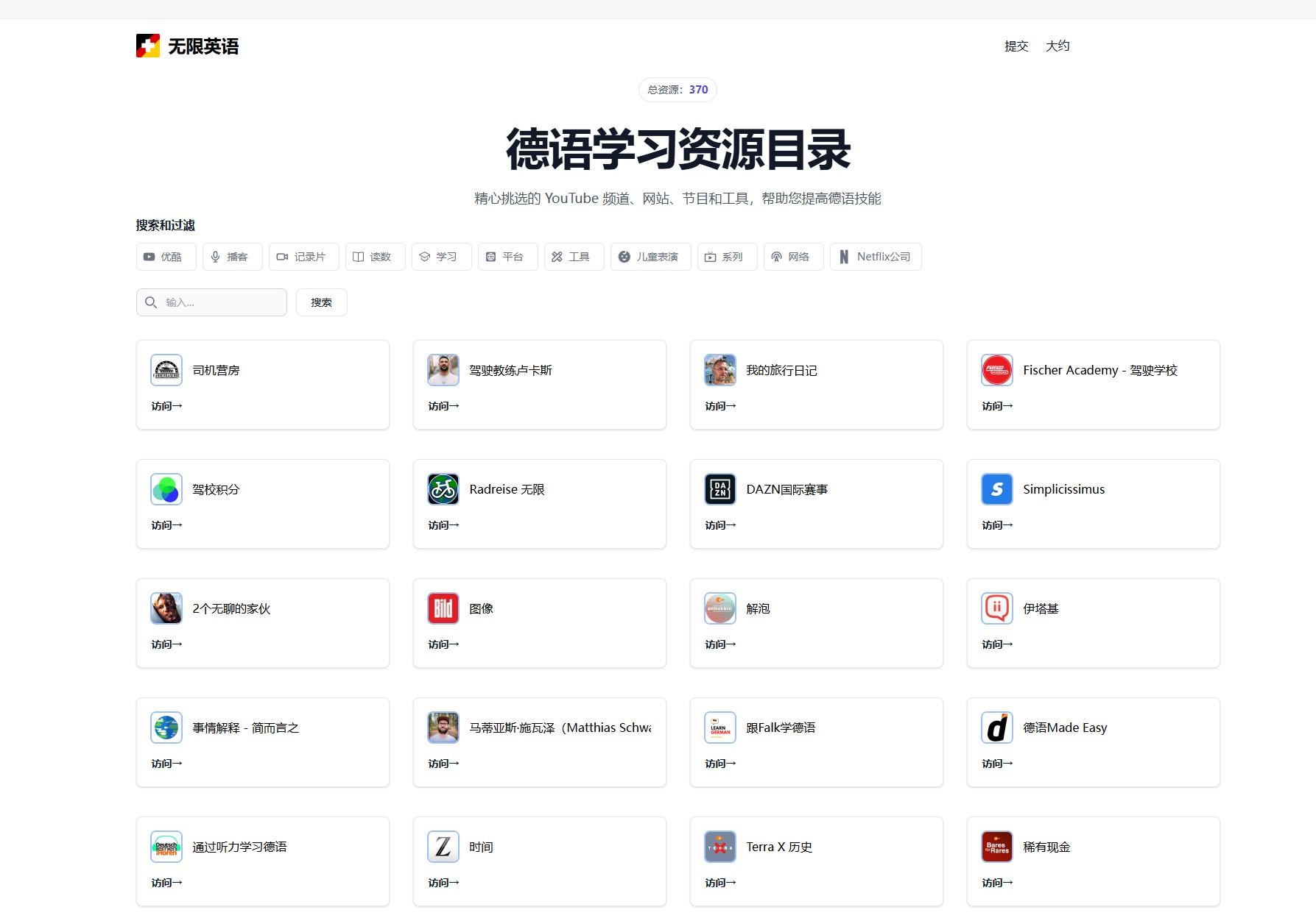 InfiniteDeutsch是一个在线德语学习资源目录网站,网站精心挑选的 YouTube 频道、网站、节目和工具,目前一共370多个,专门为德语学习者提供的资源目录,一系列工具来帮助学习该语言,帮助你提高德语技能。