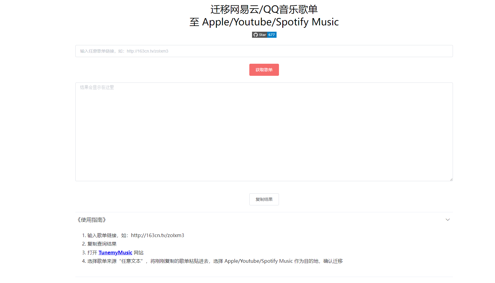 GoMusic是一个在线歌单迁移工具网站,帮助用户一键迁移网易云/QQ音乐歌单至 Apple/Youtube/Spotify Music,直接输入歌单链接,复制查询结果,打开 TunemyMusic 网站,选择歌单来源“任意文本”,将刚刚复制的歌单粘贴进去,选择 Apple/Youtube/Spotify Music 作为目的地,确认迁移,项目后端使用 Golang + Gin 开发,前端使用 Vue + ElementUI 编写。