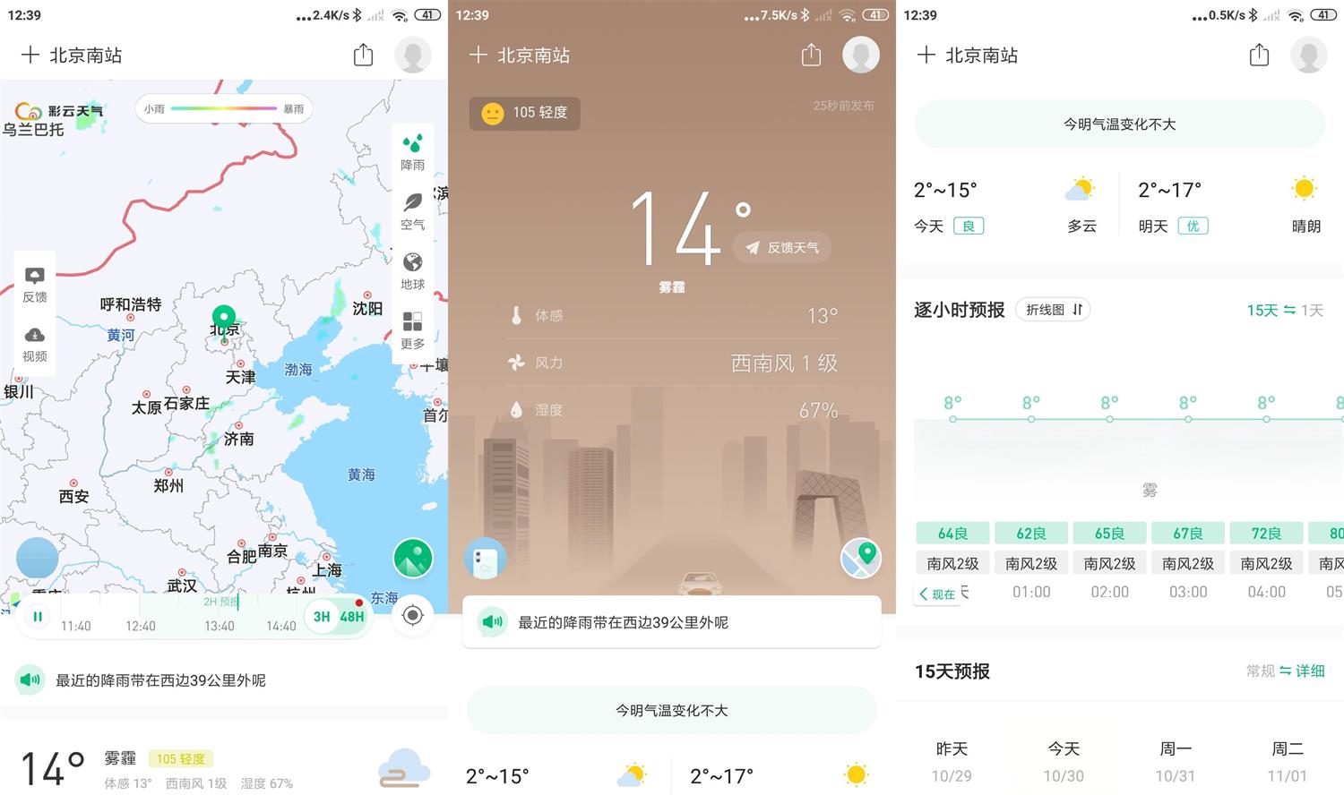 彩云天气是一款基于气象雷达图,利用人工智能算法进行分钟级降水预报的全球先驱者。彩云天气谈不上好看,流畅也欠佳,但具备了天气预报最重要的素质,准、专注短时预报,非常实用。